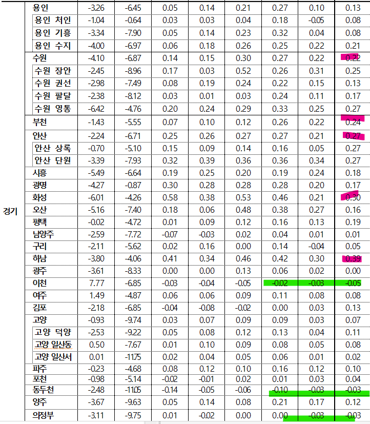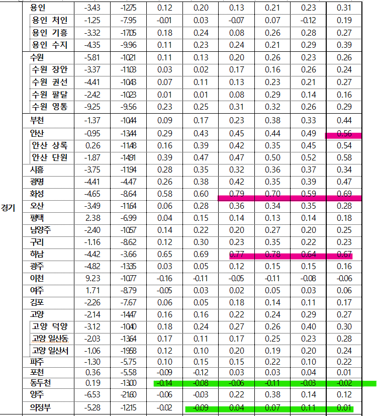 ☞몇주, 아니 몇달째 비슷한 흐름입니다. 다만 이천시가 하락이 심화됐다? 그리고 화성시가 청계, 영천 쪽의 동탄2 지역이 아닌 반월 병점쪽인 동탄1로 바뀌었다는 점이 달라진듯 합니다.