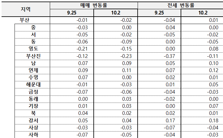 - (부산 : -0.04% → 0.01%) 강서구(0.18%)는 명지신도시 위주로 임차수요 증가하며, 연제구(0.12%)는 거제·연산동 위주로, 남구(0.10%)는 용호·대연동 위주로 상승하며 하락에서 상승전환