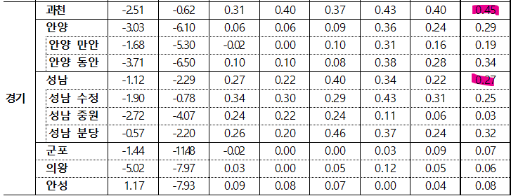 - 이천시(-0.05%)는 부발읍·송정동 위주로, 의정부시(-0.03%)는 호원·신곡동 위주로 하락했으나, 과천시(0.45%)는 부림·중앙동 신축 위주로, 하남시(0.39%)는 신장·덕풍동 위주로, 안양 동안구(0.34%)는 호계·비산동 구축 위주로, 성남 분당구(0.32%)는 정주여건 양호한 수내·정자동 위주로, 화성시(0.30%)는 병점·반월동 대단지 위주로 상승