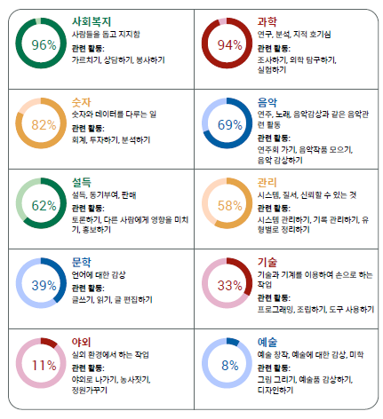 버크만에는 "흥미"라는 영역이 있는데, 이는 삶의 에너지원이고, 동력이 되는 일이라고 한다.