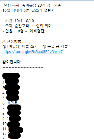 한번 할때 10명의 지원자를 받아 10일동안 글쓰기를 하는데 벌써 20기다.