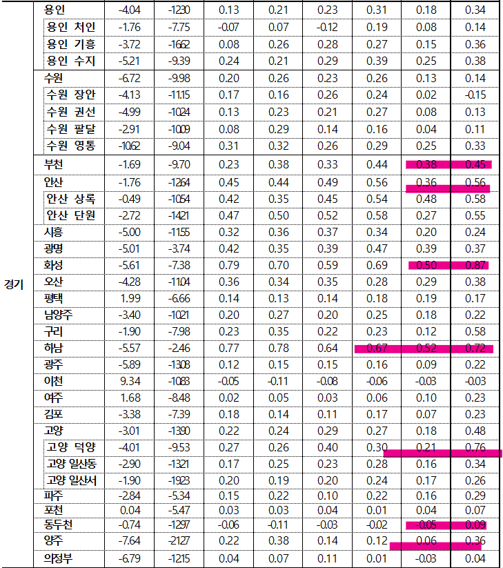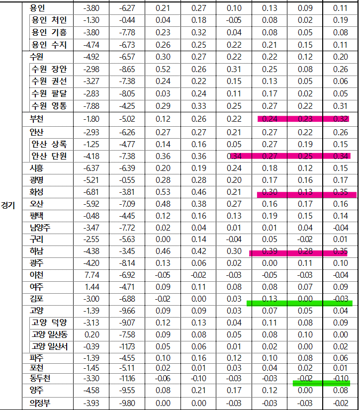 - 경기 권역은 갈놈만 더 간다. 의 느낌도 있습니다. 화성과 하남 분당은 여전히 열심히 달리고 있고, 경기 북부는 여전히 조정세입니다.