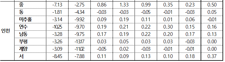 - 중구(0.50%) 매매가격 상승과 동반하여 운남중산동 주요 단지 위주로, 서구(0.37%)는 주거환경 양호한 양호한 청라동 위주로, 연수구(0.16%)는 송도·옥련동 위주로, 남동구(0.13%)는 상대적으로 상승폭이 적었던 구축 위주로 상승