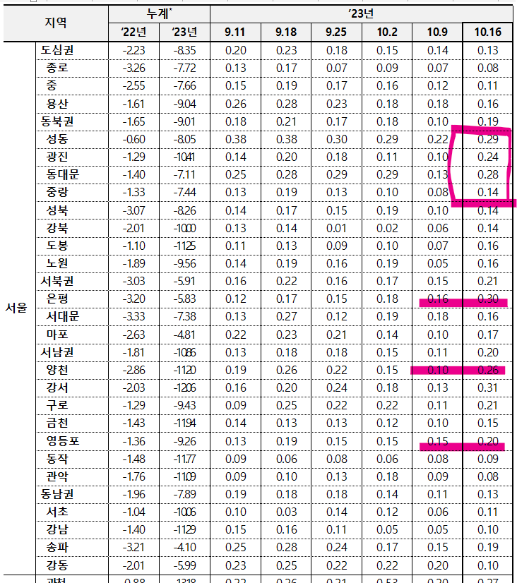 - (강북 14개구 : 0.08%) 동대문구(0.19%)는 답십리·전농·장안동 대단지 위주로, 성동구(0.16%)는 성수·옥수·금호동 선호단지 위주로, 용산구(0.15%)는 이촌·한남동 주요 단지 위주로, 광진구(0.15%)는 구의·자양동 역세권 단지 위주로, 마포구(0.12%)는 성산·합정동 위주로 상승