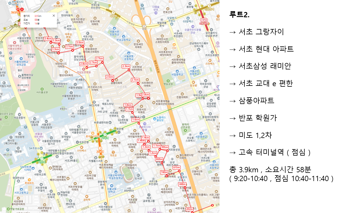 후기 1편을 못보신 분들을 위하여, .. 루트를 다시 한번 .. 오늘의 임장 루트 총 12킬로미터 정도 됩니다. 고터에서 시작하는 루트, 시작해 봅니다 자 이제 세번째 루트!!! 요기 신반포 4차도, 곧 왼
