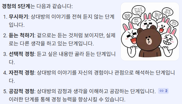 경청에도 4단계가 있다. 여기에서 1. 무시하기는 경청이 아니니까 나도 무시.